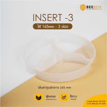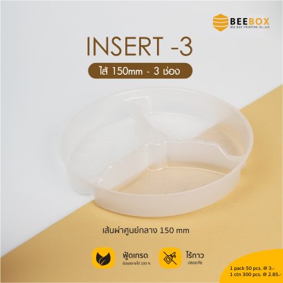 ไส้พลาสติก แยกอาหาร 3 ช่อง ขนาดเส้นผ่าศูนย์กลาง 16.5cm สามารถใส่กับน้องกล่องกลม L ขนาด 1100ml บรรจุ : 25ชิ้น/แพค 1 ลัง 200 ชิ้น **ราคาไม่รวมถ้วยและฝา**