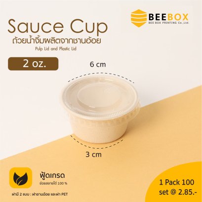 ถ้วยน้ำจิ้มชานอ้อย ฝา PET (ปิดแน่นกว่า) ฐานกว้าง 3cm ปากกว้าง 6cm สูง 3cm ถ้วยชานอ้อย ย่อยสลายได้ 100% 1 แพ็ค 100 ชิ้น / 1 ลัง 500 ชิ้น